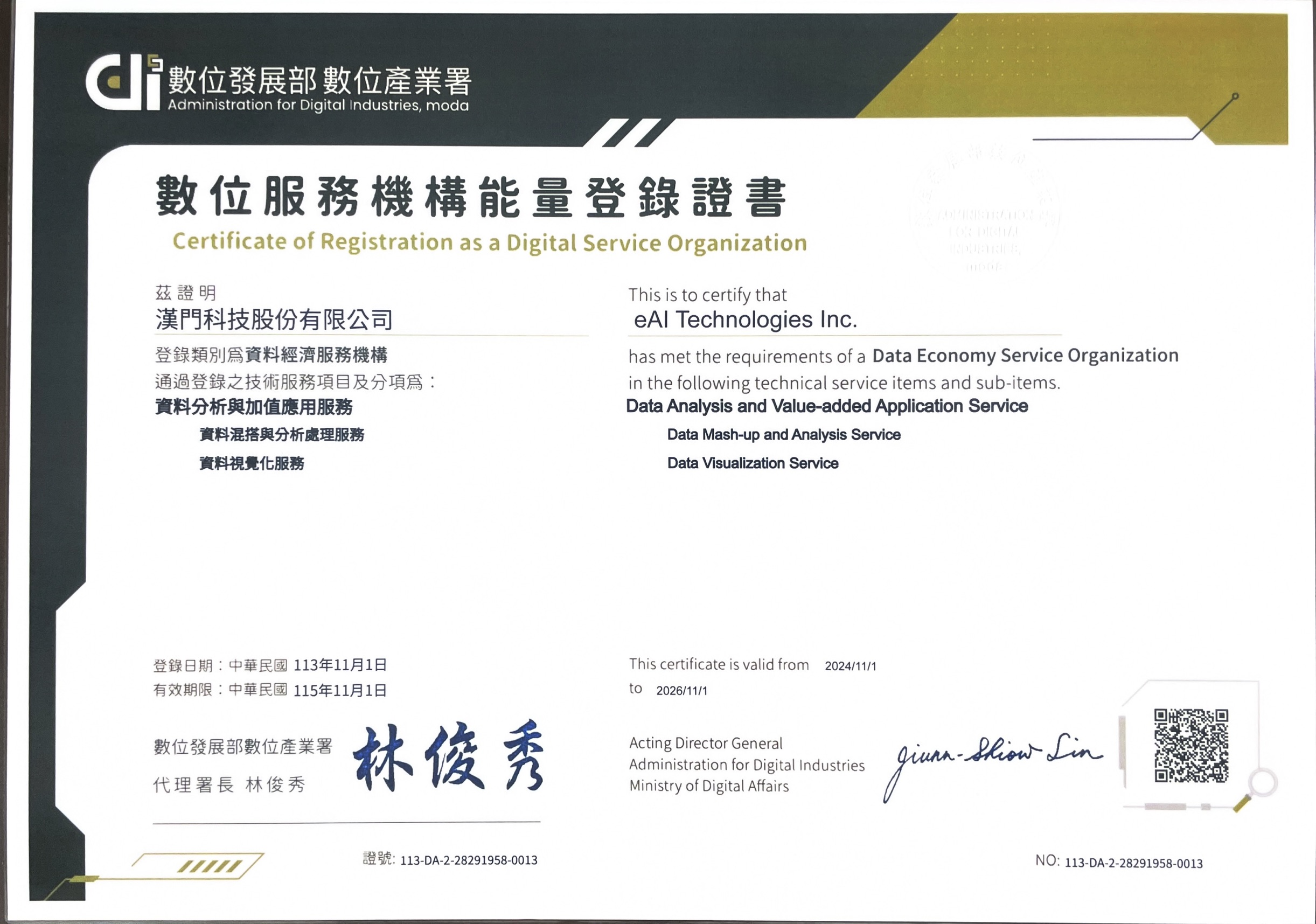 漢門科技 通過民國113年至115年 數位發展部數位產業署 服務能量登錄 ✮資料分析與加值應用服務