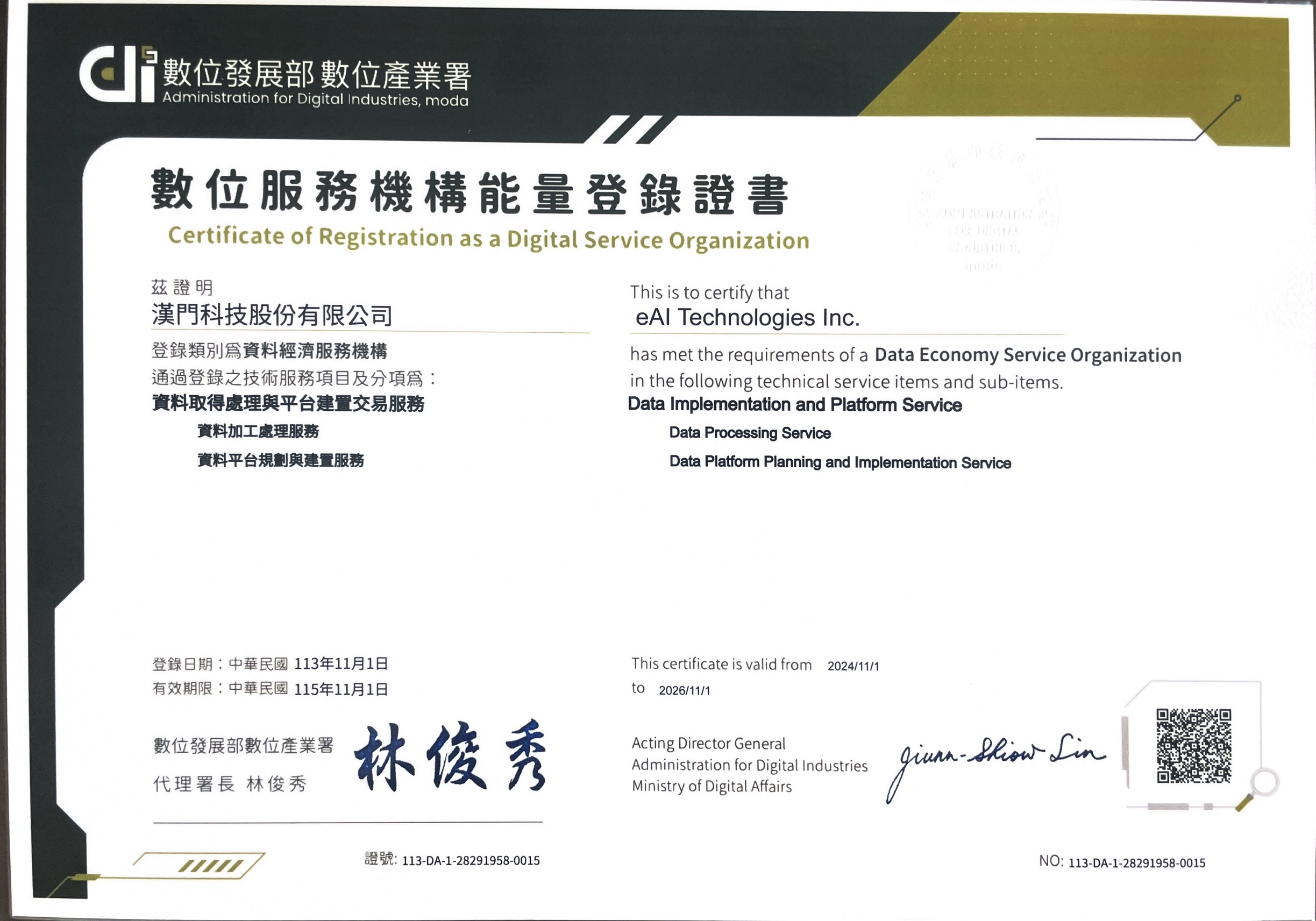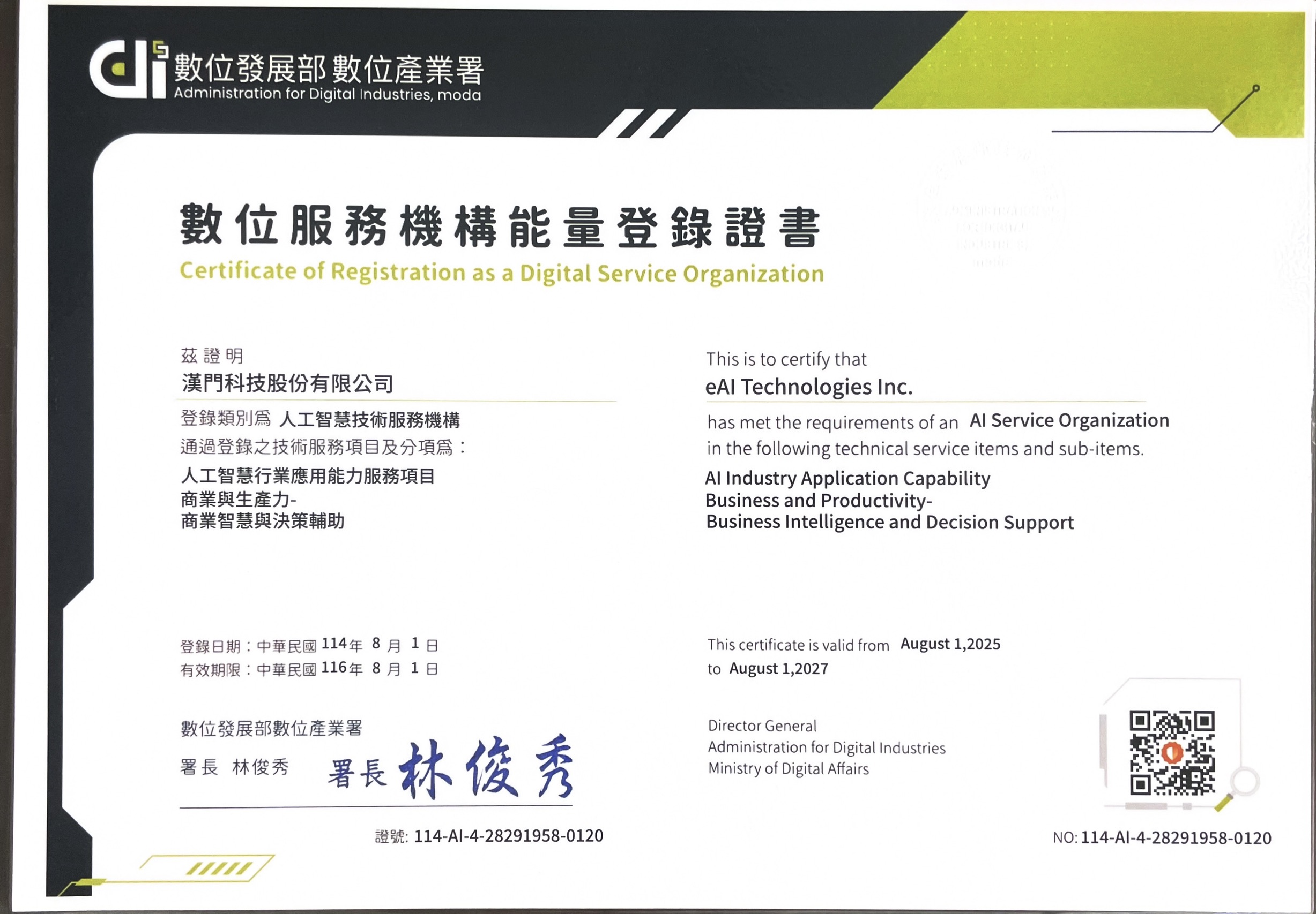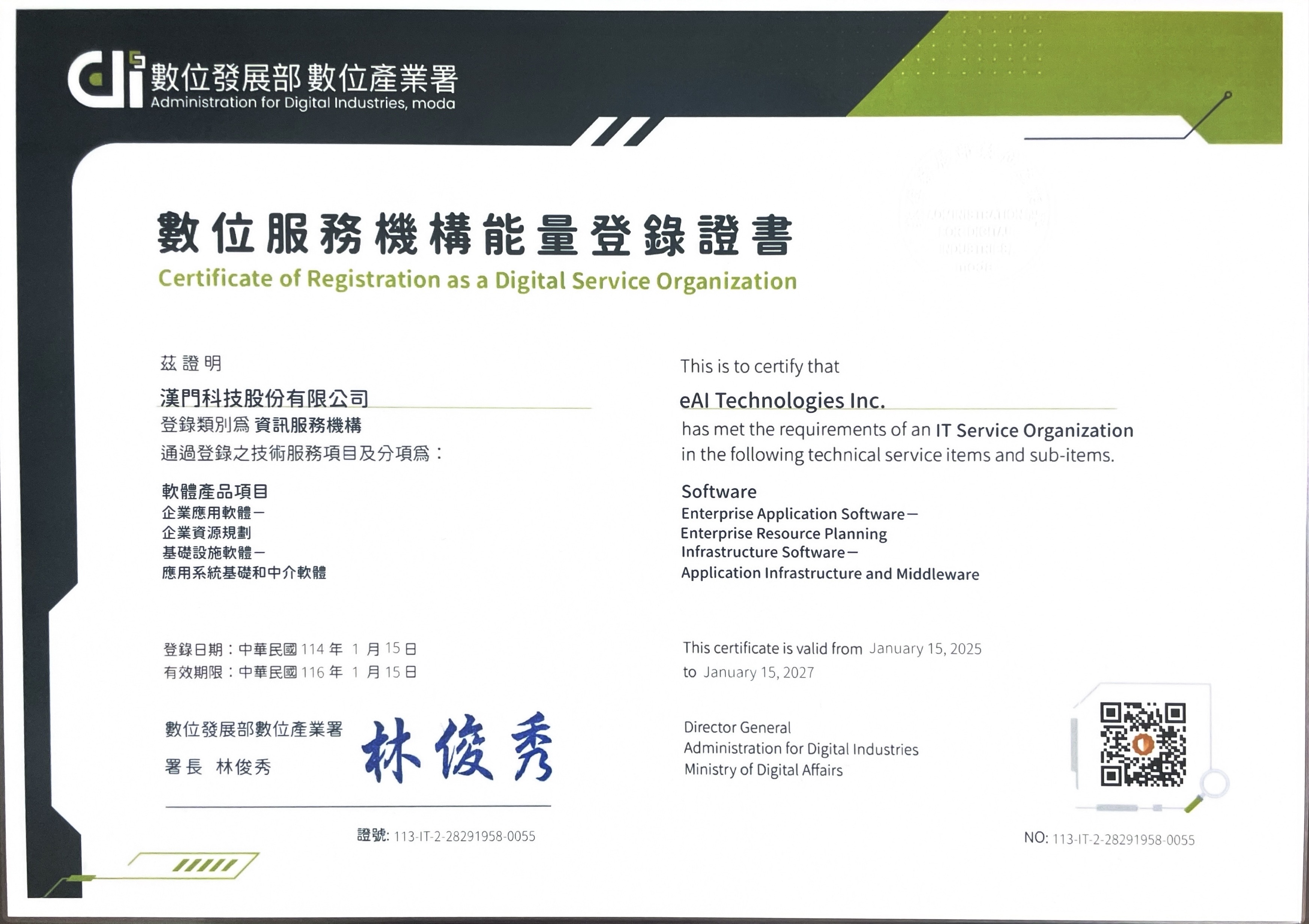 漢門科技 通過民國114年至116年 數位發展部數位產業署 服務能量登錄 ✮人工智慧行業應用能力