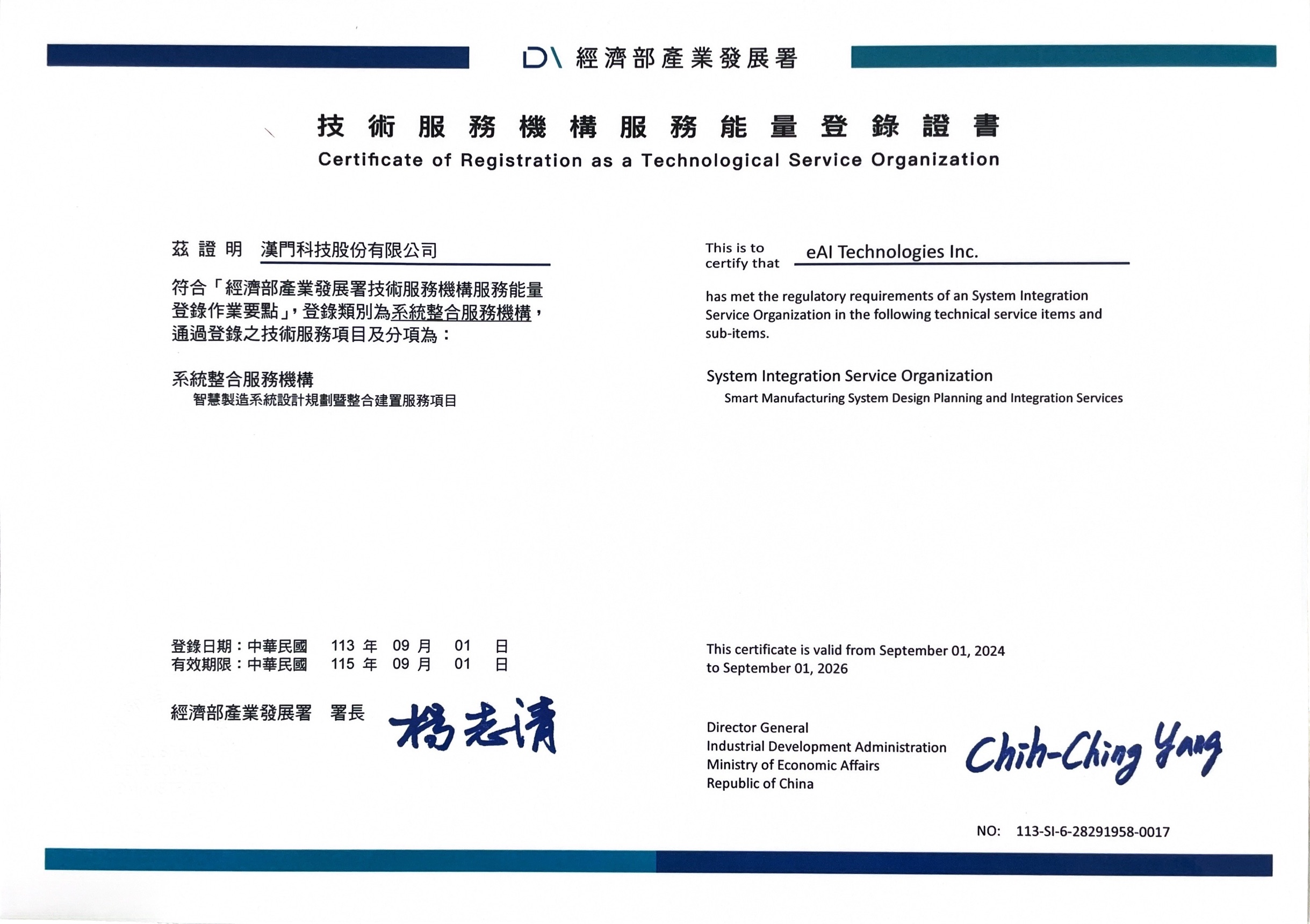 漢門科技 通過民國113年至115年 經濟部產業發展署 服務能量登錄 ✮智慧製造系統設計規劃暨整合建置服務項目